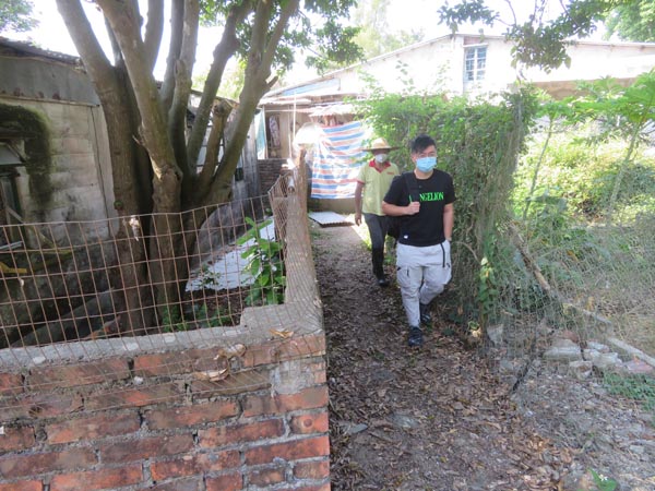 紅白藍帆布下為被覆蓋的古井,黃銘謙(黑衫者)指維修古井外,狹窄的周邊空間有必要擴闊。