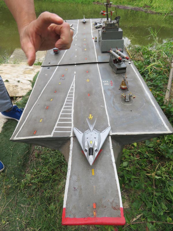 兩模型船來年或要多多出巡,明哥早前特地從貨櫃拿出來試水,黃銘謙、廖志協等人在旁觀看。不過因遙控電池有問題,在小魚塘的航母走得很慢,還有點傾斜。明哥解釋航母上闊下窄,保持平衡最難。潛艇則有死穴,它只能浮進及潛,不能在水底潛控,即不可令潛艇在水底向前向後推進,原來明哥買不到遙控,那是軍用的海底聲波雷達遙控,市場無得賣。