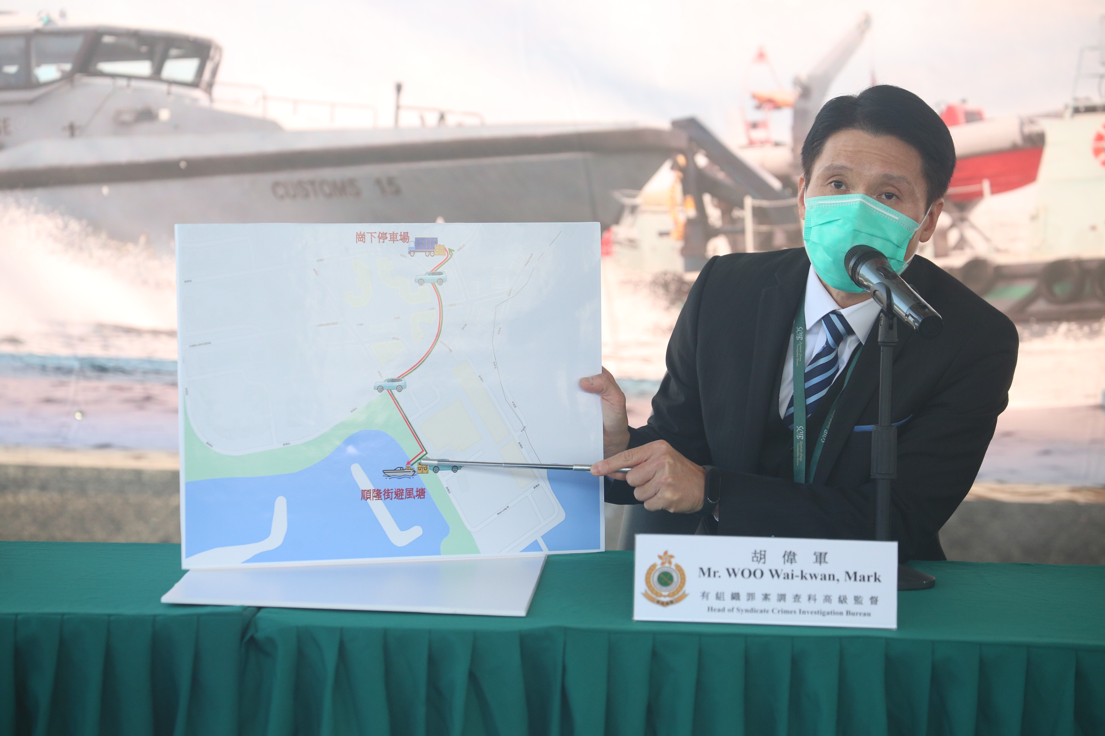 海關有組織罪案調查科高級監督胡偉軍中午在記者會上表示,水警和海關在2星期前鎖定1個活躍於沙頭角區的走私集團,他們以貨車作流動貨倉,在崗下村1個停車場停泊,並將走私貨物交給到來取貨的7人車,再駛往附近順隆街避風塘卸貨,向香港東北水域走私貨物到內地。