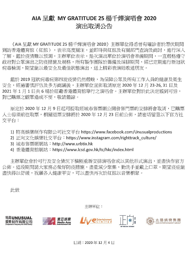退票安排會在本月23日前公布,並於可行及安全情況下積極重新安排演唱會或改以其他形式演出。