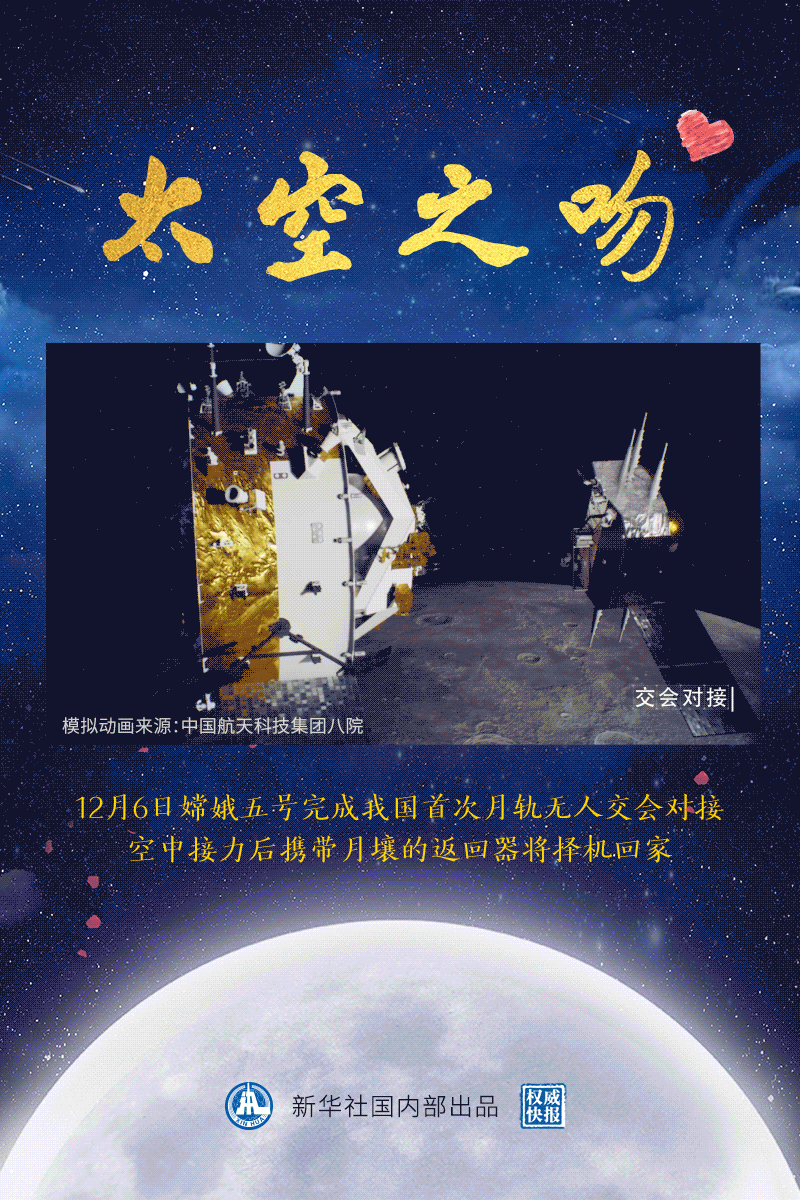 北京時間12月6日5時42分,嫦娥五號上升器成功與軌道器和返回器組合體交會對接,並於6時12分將樣品容器安全轉移至返回器中。這是中國首次實現月球軌道交會對接。