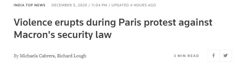 據路透社,當地時間周六,法國首都巴黎繼續有數千民眾示威遊行,要求撤回早前獲國民議會通過的《整體安全法案》。遊行開始后不久再次演變成衝突,防暴警察發射催淚彈驅散。