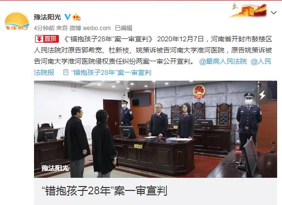 據河南省高級人民法院官方微博消息顯示,2020年12月7日,河南省開封市鼓樓區人民法院對原告郭希寬、杜新枝、姚策訴被告河南大學淮河醫院,原告姚策訴被告河南大學淮河醫院侵權責任糾紛兩案一審公開宣判。