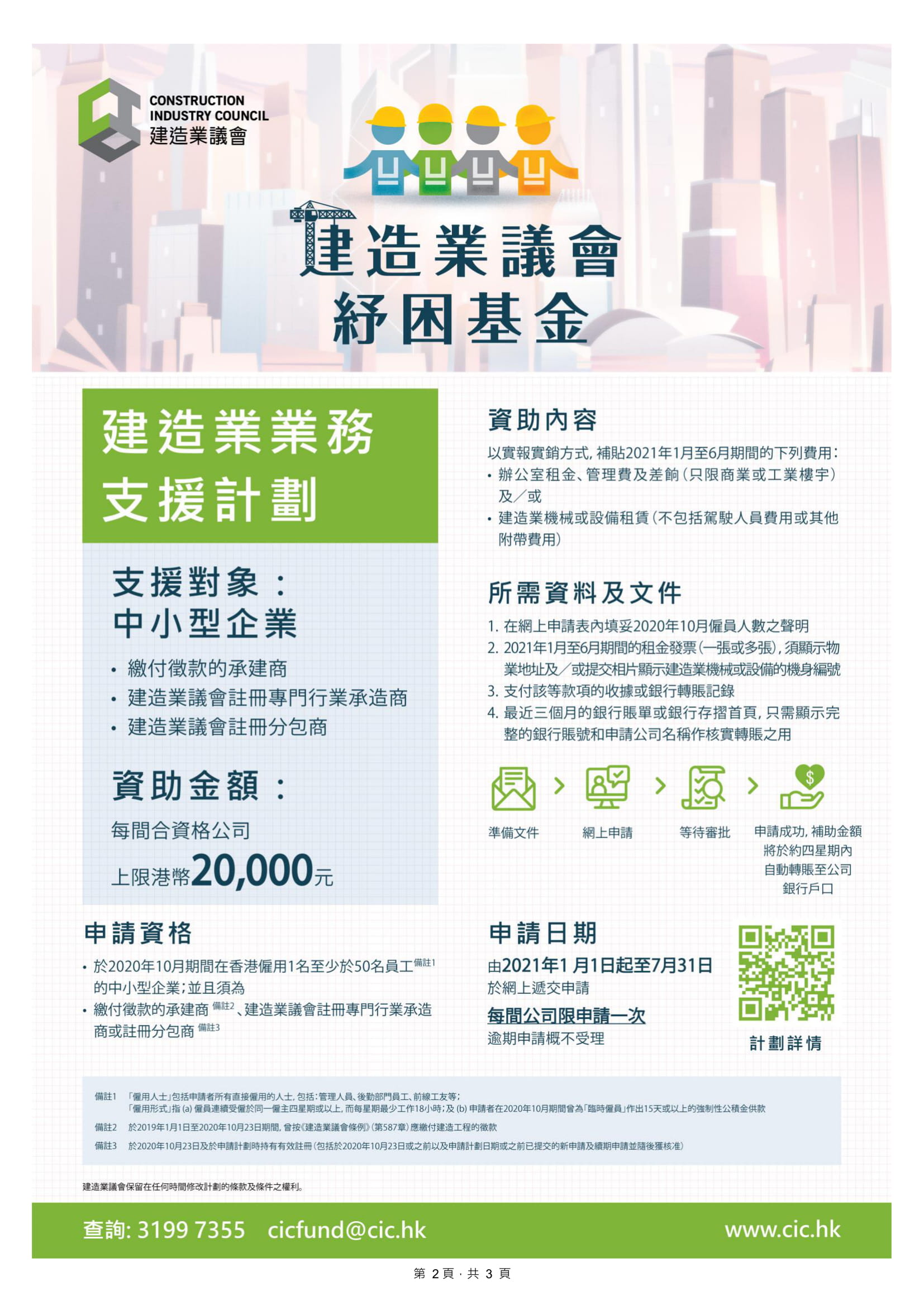 建造業議會宣布將撥款1.2億元於2021年1月1日推出「建造業議會紓困基金—建造業業務支援計劃」,以支援建造業的中小型企業。