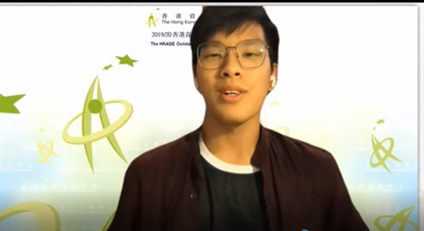 香港資優教育學苑向升讀科技大學的李智滔頒發傑出學生獎,以表揚他積極為學員策劃不同類型的活動。