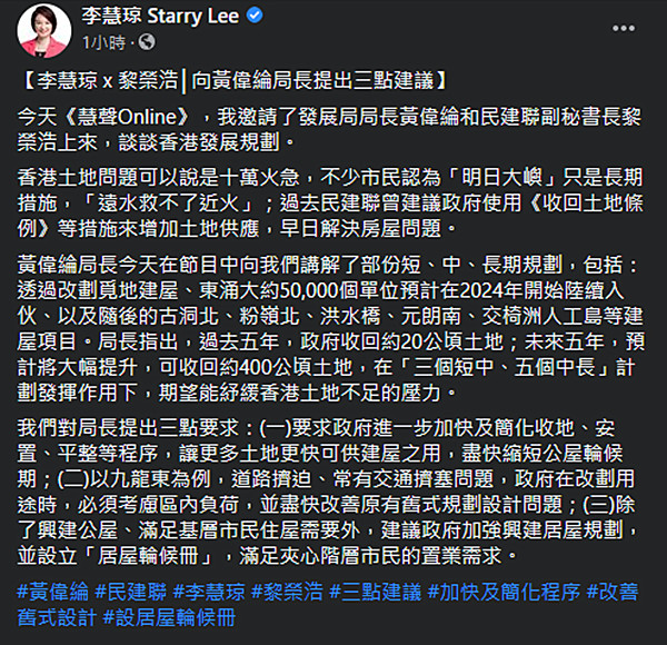 民建聯主席李慧琼在社交平台表示,她邀請了發展局局長黃偉綸談論香港發展規劃。