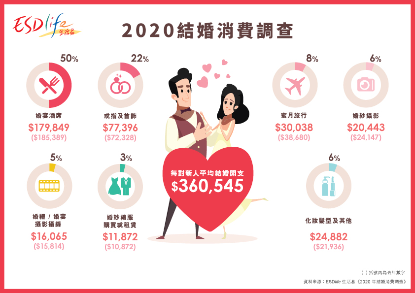 去年的全年結婚宗數為44247宗,以今年1月至9月結婚宗數下跌四成半作推算,2020年全年結婚宗數約為24360宗,根據調查的平均結婚開支推算,2020年香港整個結婚消費市場總值估計為港幣88億元,比去年大幅下跌四成六。