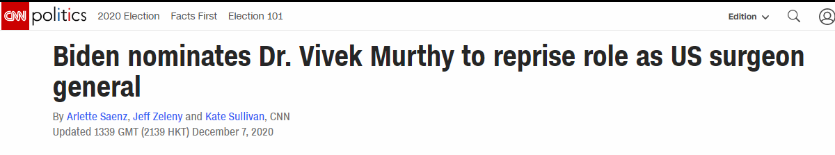 據CNN消息,當地時間12月7日,拜登宣布任命維維克·穆西擔任美國衛生局局長。