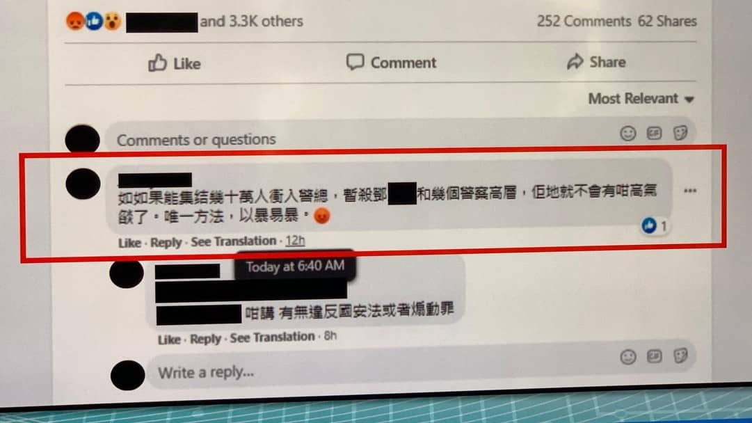 有網民早前在社交媒體声称,要聚集數十萬人衝入灣仔警察總部殺死警務處處長鄧炳強。警方表示,今年12月初,有人在Facebook發布針對警隊言論,鼓吹衝擊警察總部和殺害警隊管理層,帖文在網絡瘋傳,引起公眾人士關注。該帖文在網上流傳幾日後被刪除。警方經深入調查後,鎖定一名50歲本地男子,昨日下午在牛頭角區,以「煽惑他人意圖造成身體嚴重傷害而傷人」罪名將其拘捕,檢取兩部手提電話。