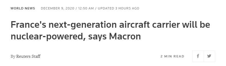 他表示,核能仍然會是法國戰略自主的基石,法馬通將會為新航母製造重要部件,法國的能源、生態及經濟未來,將透過核能來構建。據悉,法國計劃於2025年底架設建造下一代航母的工地,2036年對新航母進行海試,2038年則正式投入使用。