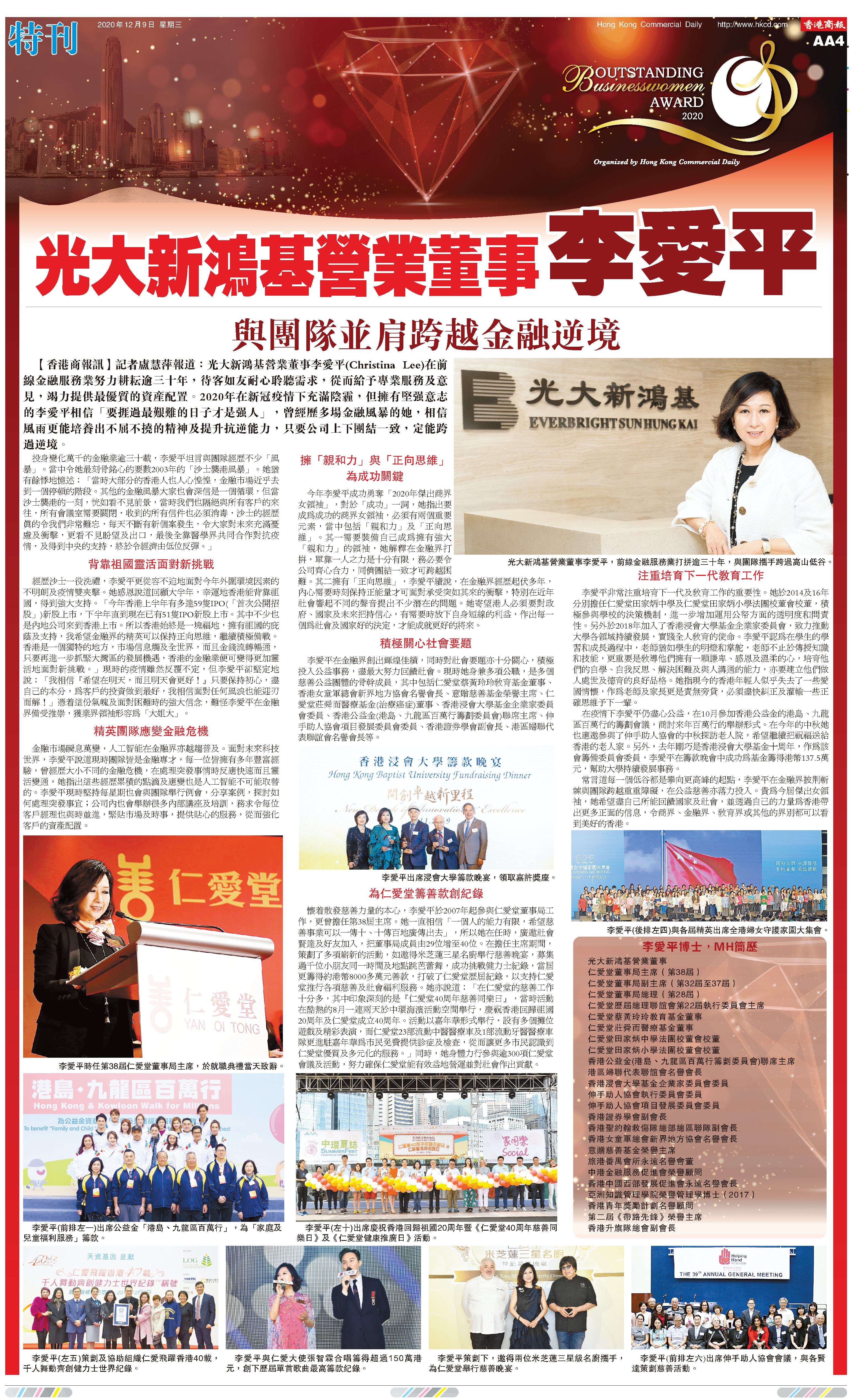 常言道每一個低谷都是攀向更高峰的起點,李愛平在金融界披荊斬棘與團隊跨越重重障礙,在公益慈善亦落力投入。貴為今屆傑出女領袖,她希望盡自己所能回饋國家及社會,並透過自己的力量為香港帶出更多正面的信息,令商界、金融界、教育界或其他的界別都可以看到美好的香港。(記者 盧慧萍)