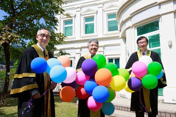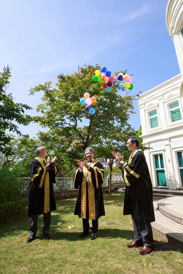 香港教育大學指影片於校長宿舍「聚學樓」外拍攝,張仁良、李子建及呂大樂一同放色彩繽紛的氣球,喻意畢業生迎向人生新一頁。