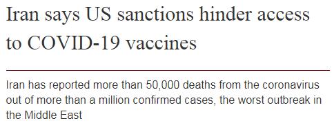 據美聯社9日報道,伊朗總統哈桑·魯哈尼(Hassan Rouhani)周三表示,美國實施的制裁,令伊朗難以從海外採購購買藥品和醫療用品,包括新冠病毒疫苗。他表示,即使是從其他國家購買藥物的簡單交易,亦極為困難,並需時數星期才能轉移資金,但當局仍會盡力向海外採購疫苗,希望盡快為高危群組接種。 伊朗早前表示,計劃採購2千萬劑新型冠狀病毒疫苗,同時自行研發疫苗,預期下月開始在人體測試。