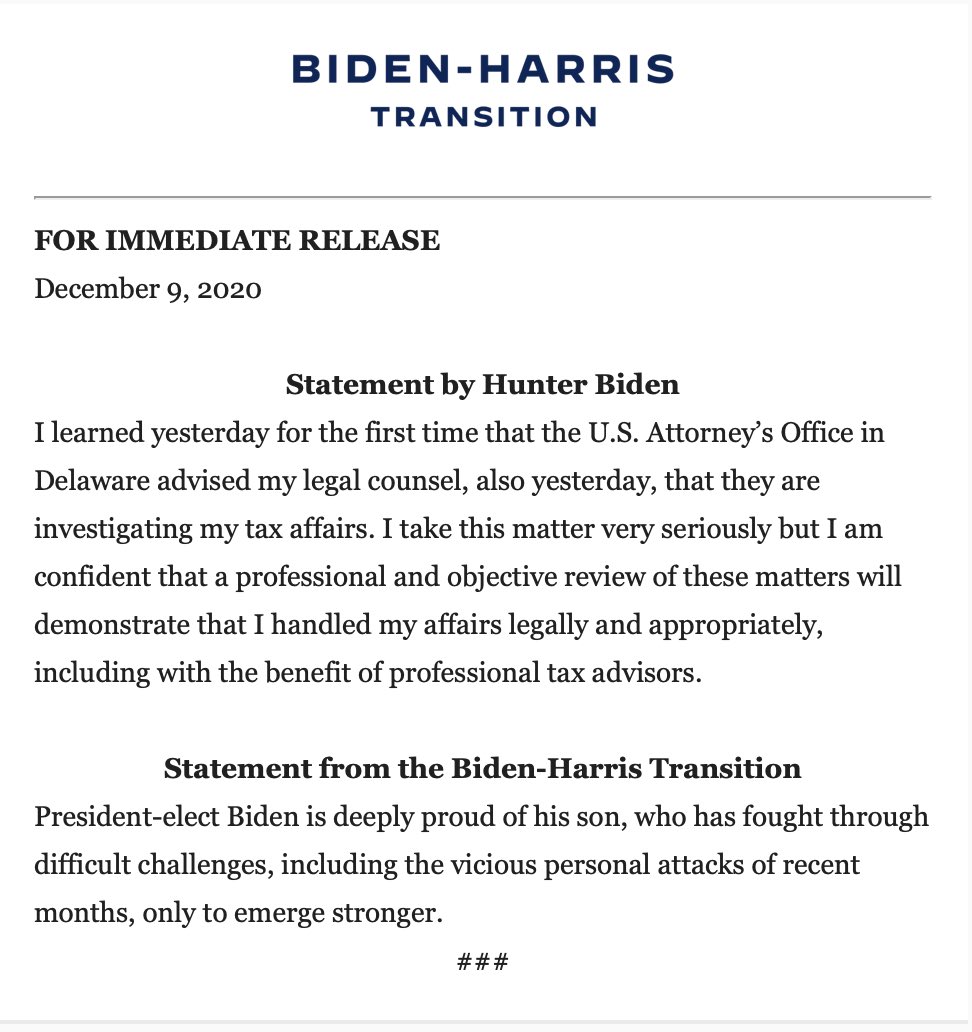 亨特·拜登在聲明中說:「我會非常認真地對待調查,但我相信一個專業而客觀的審查將證明我合法並妥當地處理了相關事務,包括與專業稅務顧問的往來。」聲明的最後附上了一份來自拜登和當選副總統哈里斯過渡團隊的簡短聲明,該聲明說:「當選總統拜登深深地為他的兒子感到驕傲。亨特經歷了眾多嚴峻挑戰,包括最近幾個月的惡意人身攻擊,但他只會變得更強大。」