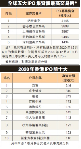 會計師事務所畢馬威10日發表《中國內地和香港IPO市場2020年回顧》報告,至12月6日截數為止,香港新股集資金額達503億美元(約3898億港元),按年升24.5%,全球排名第二,僅次於納斯達克。畢馬威又預料,明年本港將有130至150隻新股在港上市,集資額介乎3500億至4000億元,與今年相若,有信心明年會維持全球首三位。