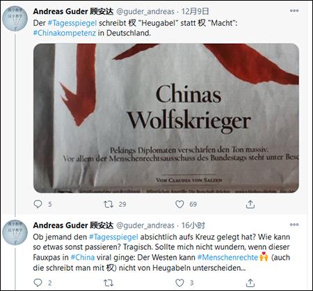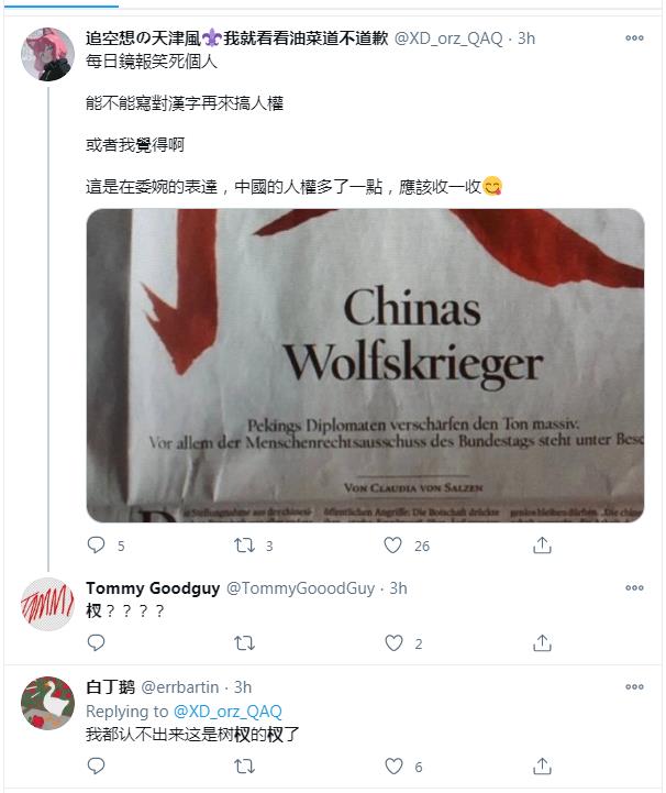 德國漢學專家顧安達也發推吐槽:「這是誰故意要整《每日鏡報》嗎?不然怎麼會發生這種事?太悲劇了。如果這個失誤在中國傳開了我也不會感到驚訝:西方竟然連人權的『權』和『杈』都分不清……」