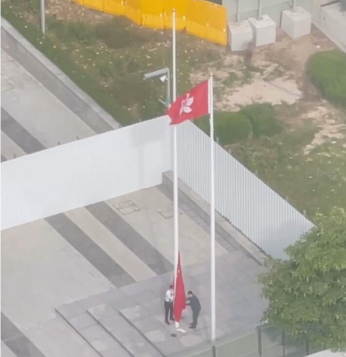 今早9時許,有市民發現立法會廣場的國旗倒掛,遂拍照上傳至社交網站。約半小時後,有兩名職員重新升起國旗。