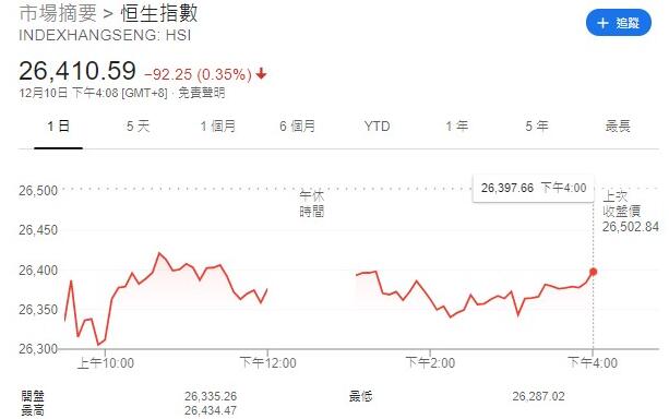 港股主要指數全天弱勢,市場情緒表現低迷。恒指收報26410點,跌0.35%或92點。國指跌0.69%報10415點,恒生科技指數跌0.94%。