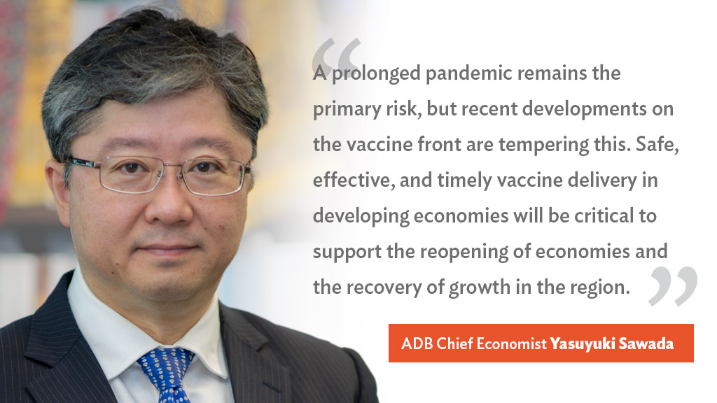 ADB首席經濟學家澤田康幸(Yasuyuki Sawada)表示,亞洲發展中經濟體增長前景正在好轉,區內兩個最大經濟體中國和印度的增長預期已被上調。疫情依舊是最大的風險,但近期疫苗工作的進展使情況緩和,為發展中經濟體及時提供安全有效的疫苗,支持區內經濟體重新開放和恢復增長。