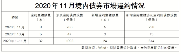 近期信用債違約頻現:11月10日,永城煤電公告稱,因流動資金緊張,「20永煤SCP003」未能按期足額償付本息,已構成實質性違約,違約本息金額共計10.32億元;11月16日,中國芯片制造商清華紫光集團和汽車廠商華晨汽車集團雙雙宣布違約。華晨集團公告稱,已構成債務違約金額合計65億元。11月20日,華晨集團正式進入破產重整程序。