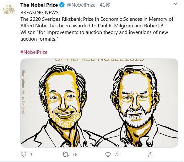 當地時間10月12日,瑞典皇家科學院將2020年諾貝爾經濟學獎授予保羅·米爾格羅姆和羅伯特·威爾遜。圖源:諾貝爾獎官方社交賬號截圖