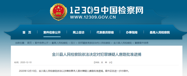 據中國檢察網12日消息,2020年12月10日,金川縣人民檢察院依法以涉嫌故意殺人罪對嫌疑人唐路批准逮捕。案件正在進一步辦理中。