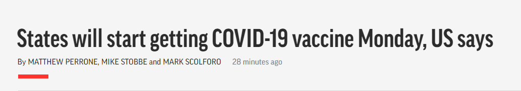 美國食品藥物管理局已正式批准緊急使用美國藥廠輝瑞和德國BioNTech聯合研發的疫苗。監督運送工作的人员表示,隨着貨運公司周日將疫苗送到近150個地點,負責運送的貨車會陸續開出。另外450個地點會在星期二及星期三收到疫苗,包括醫院及其他可以用超低溫儲存疫苗的設施,相信在三星期內,疫苗會送到藥房及其他地方。