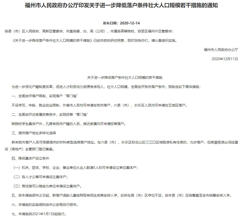 12月14日,福州市人民政府網發布《關於進一步降低落戶條件壯大人口規模的若干措施》。一、全面放開落戶限制,實現落戶「零門檻」。不設學歷、年齡、就業創業限制,外省市人員均可申請在我市落戶,六縣(市)、長樂區人員均可申請在五城區落戶。二、全面放開近親屬投靠條件,實現投靠「零門檻」。除院校學生集體戶外,凡具有我市戶籍的人員,其近親屬均可申請投靠落戶。三、提供落戶地址多樣化選擇。四、降低集體戶設立條件。