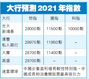 多間投資機構發表明年市場展望,其中滙豐私人銀行對明年環球股市抱持「增持」看法,認為在內地經濟出現周期性復蘇的推動下,看好中資股前景。該行預測,恒指於明年年底目標在29970點,國企指數目標在11950點。光大新鴻基亦認為,隨着明年環球經濟及企業盈利可望復蘇,市場避險意識或進一步減退,預料資金流入亞洲區資產,估值修復將支持區內股市表現,港股明年有望上試29000點。(記者 吳天淇)