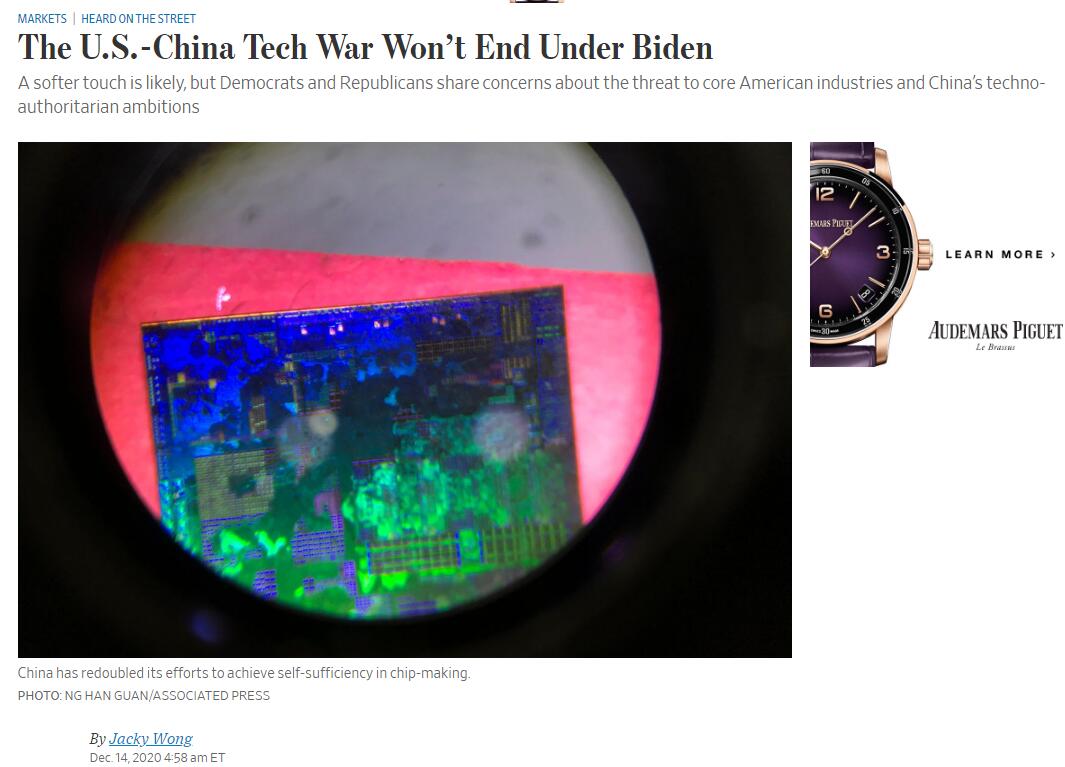 據《華爾街日報》(WSJ)周二報道,拜登政府上台後,中美之間的科技大戰並不會偃旗息鼓。拜登政府與北京的接觸可能不會再像特朗普時期那般劍拔弩張。但不論是民主黨還是共和黨,都對中國科技的迅猛發展深感擔憂。