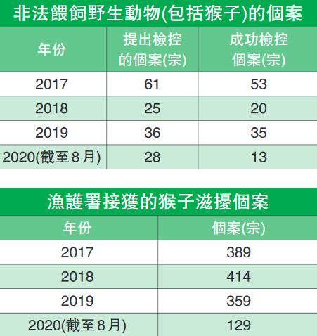 活躍於人群之間的香港猴子,數量已由10年前的高峰回落,然而向人群討食、搶食的行為沒變,滋擾個案維持每年數百宗,11月上旬便發生兩宗城門水塘猴子咬傷行山人士個案。市民對猴子則愛恨交纏,金山郊野公園是餵猴熱門地,在芸芸餵猴者中,只有6人是合法,持有政府發出的「特別許可證」。協助合法餵猴人的義工說,香港猴子食物不足,見過沒東西吃的猴子狀如喪屍,很可憐,希望政府可恢復發證;但不贊成餵猴的市民指猴子出現已數千年,至今未有絕種,牠們自會找東西吃,人工餵飼只會削弱猴子的野外覓食本能,「愛猴變成害猴」。
