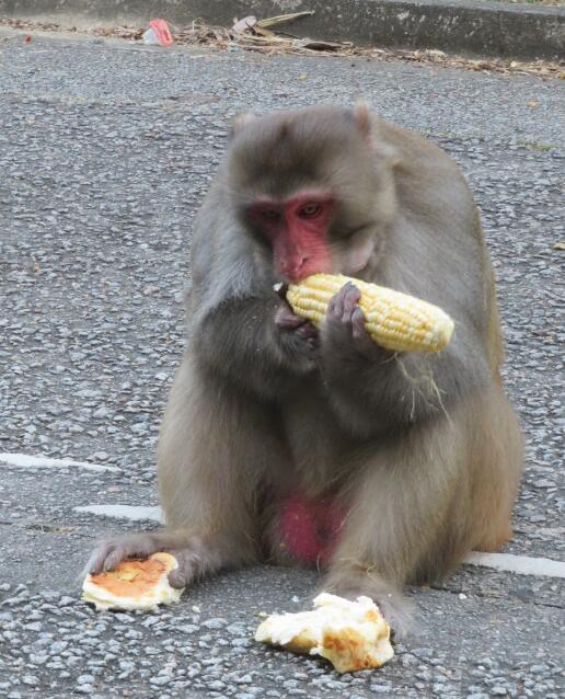 這隻猴子搶到粟米和麵包,吃個不亦樂乎!記者 鄭玉君攝