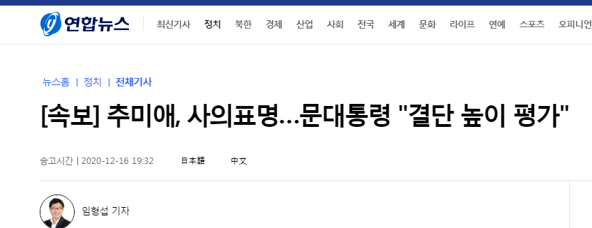 據韓聯社16日最新消息,韓國法務部長秋美愛申請辭職。
