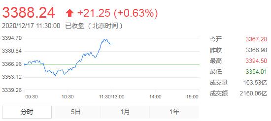 12月17日,星期四,農曆十一月初三。消息面較為淡靜,今早A股三大指數近乎平盤開出,開盤后,股指進行了近1個小時的調整,其中創業板指數調整更為堅決,幅度較深。10點半后,兩地股指都走出震蕩攀升走勢,巧合的是,上證綜指和创业板指数截至午間收盤的漲幅都為0.63%。盤面上,白酒股強勢依舊,港口航運概念崛起,疫苗板塊集體大漲,證券板塊也漲幅居前,而醫美、農業種植、國防軍工板塊跌幅居前。總體兩市個股漲多跌少,賺錢效應好轉。
