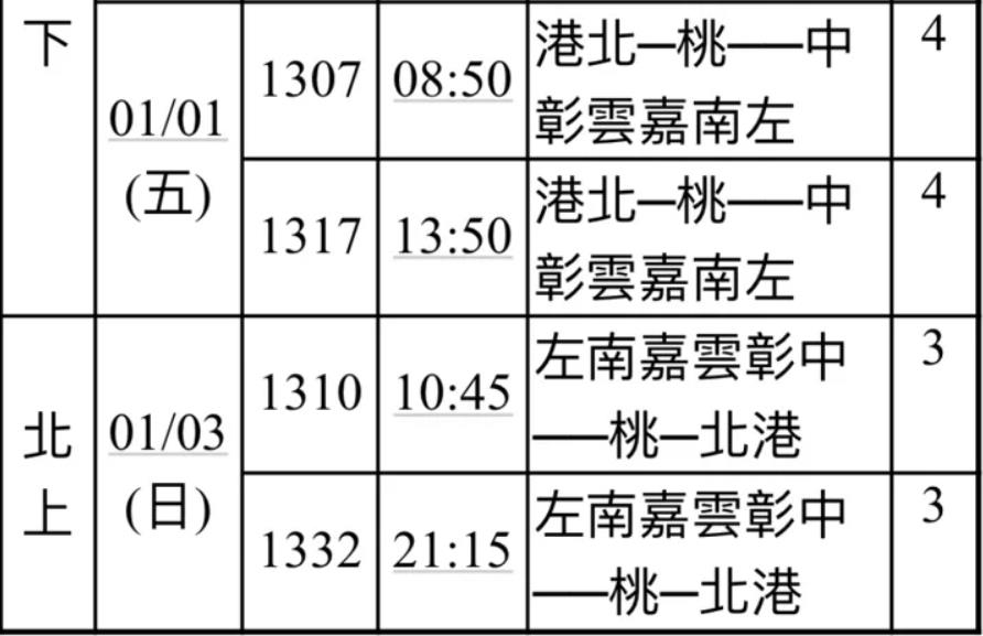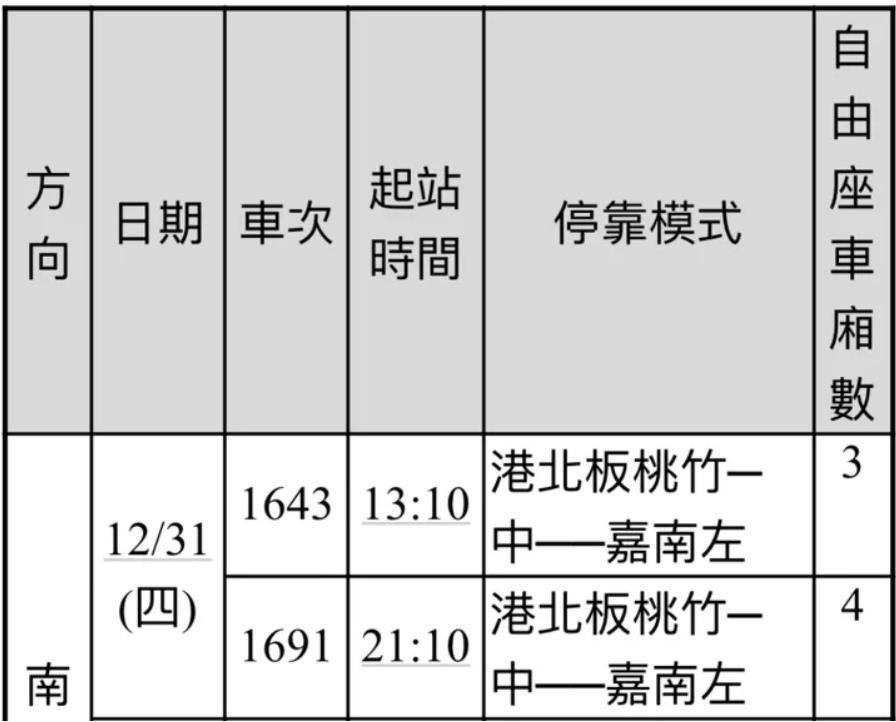 加開班次為,南下:12月31日,起站時間13:10,車次1643;12月31日,起站時間21:10,車次1691;1月1日,起站時間08:50,車次1307;1月1日,起站時間13:50,車次1317。北上部分,1月3日,起站時間10:45,車次1310;1月3日,起站時間21:15,車次1332。