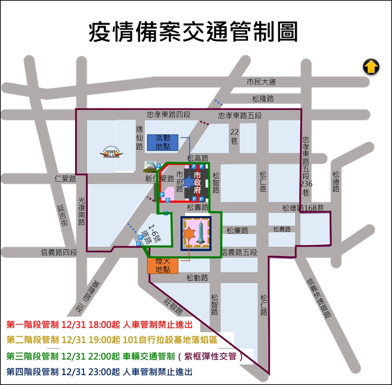 然而,交通局也提醒,跨年晚會活動若受到疫情影響,將改為線上轉播不開放民眾進場,信義計劃區則將從31日晚間6時起直接實施第4階段交管。