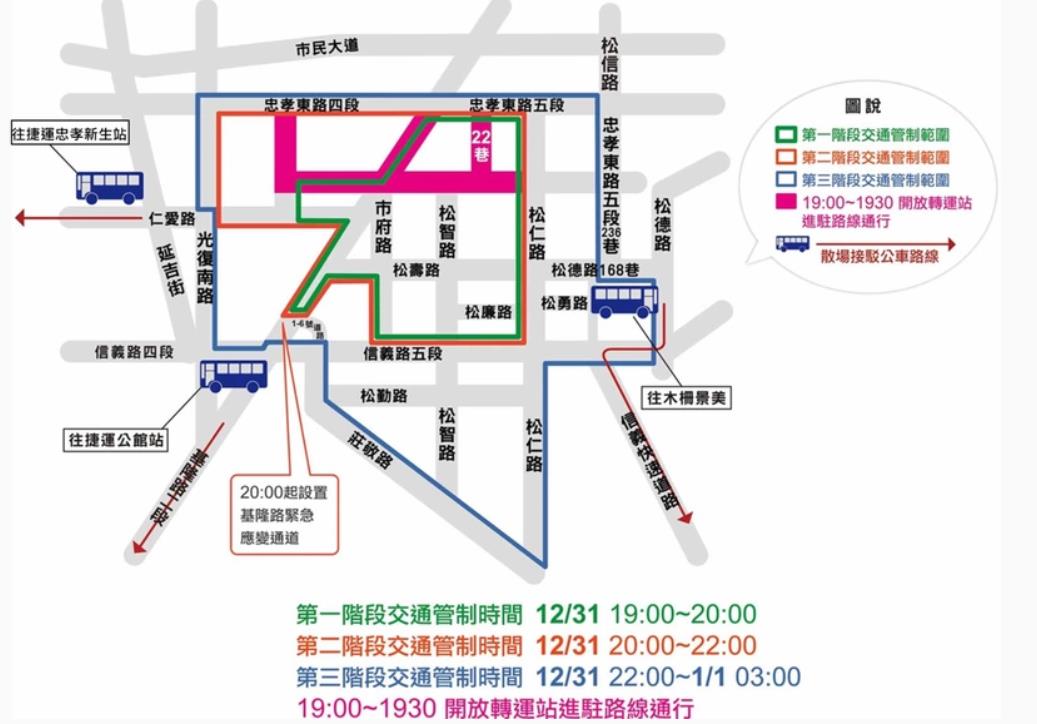 市府轉運站自12月31日晚間7時30分起車輛管制禁止進入,旅客須至管制區外的替代站位搭車,市府轉運站地下連通道(自12月31日21時起)、微風信義地下連通道(自12月31日22時起)、台北101/世貿捷運站地下連通道(自12月31日22時起)關閉。