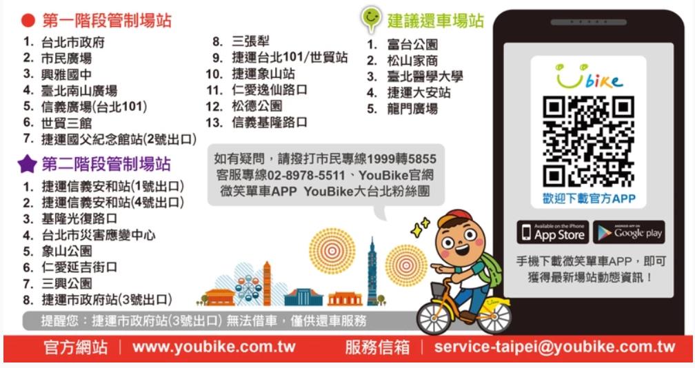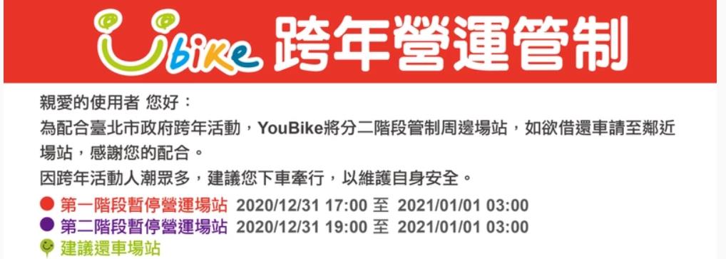 交通局指出,跨年活動人潮眾多,考量人潮安全,管制區域內禁止騎乘自行車;YouBike租借站也配合活動分階段管制。當天下午5時起信義計劃區周邊13站暫停營運。