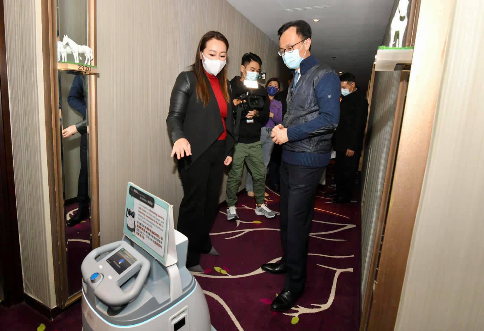 公務員事務局局長聶德權今日(17日)在社交平台發文指,有5間指定檢疫酒店明日(18日)會率先投入服務,而配合的指定交通亦同時啓用。他早上已到其中一間酒店視察,了解登記入住、入住第12日的檢測流程以及退房等環節,酒店還安排了機械人為檢疫客人送餐及消毒走廊。