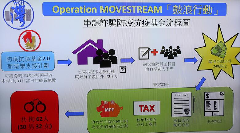新冠肺炎疫情嚴重打擊本港旅遊業,港府早前推出防疫抗疫基金支援計劃,警方接獲負責旅遊代理商註冊處舉報,指7間小型旅行社以虛假資料誇大員工數目,圖詐騙基金284萬元。警方經調查後早前展開代號「鼓浪」行動,拘捕62名男女。