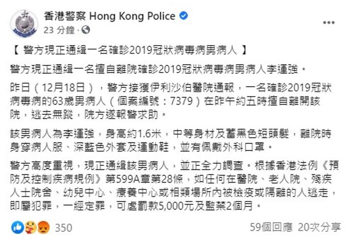 其后,警方今日下午表示,昨日接獲伊利沙伯醫院通報,一名確診2019冠狀病毒病的63歲男病人(個案編號:7379)在昨午約5時擅自離開該院,逃去無蹤,院方遂報警求助。該男病人為李運強,身高約1.6米,中等身材及蓄黑色短頭髮,離院時身穿病人服、深藍色外套及運動鞋,並有佩戴外科口罩。警方高度重視,現正通緝該男病人,並正全力調查。