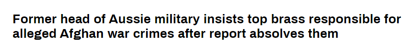 據「今日俄羅斯」(RT)19日消息,澳大利亞退休海軍上將、澳國防軍前司令克里斯·巴里表示,澳大利亞軍方領導層應對其軍隊在阿富汗犯下的任何罪行負責。此前,澳大利亞軍方公布的一個調查報告證實,在阿富汗執行任務的澳軍人涉嫌戰爭罪,製造了多起殺害囚犯和無辜平民事件。
