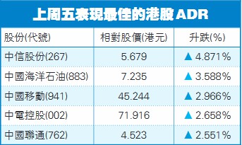 港股ADR大型藍籌個別發展,滙豐控股(005)收報40.62元,較港收市跌0.53元;騰訊控股收報583.83元,較港收市升3.83元。(記者 吳天淇)