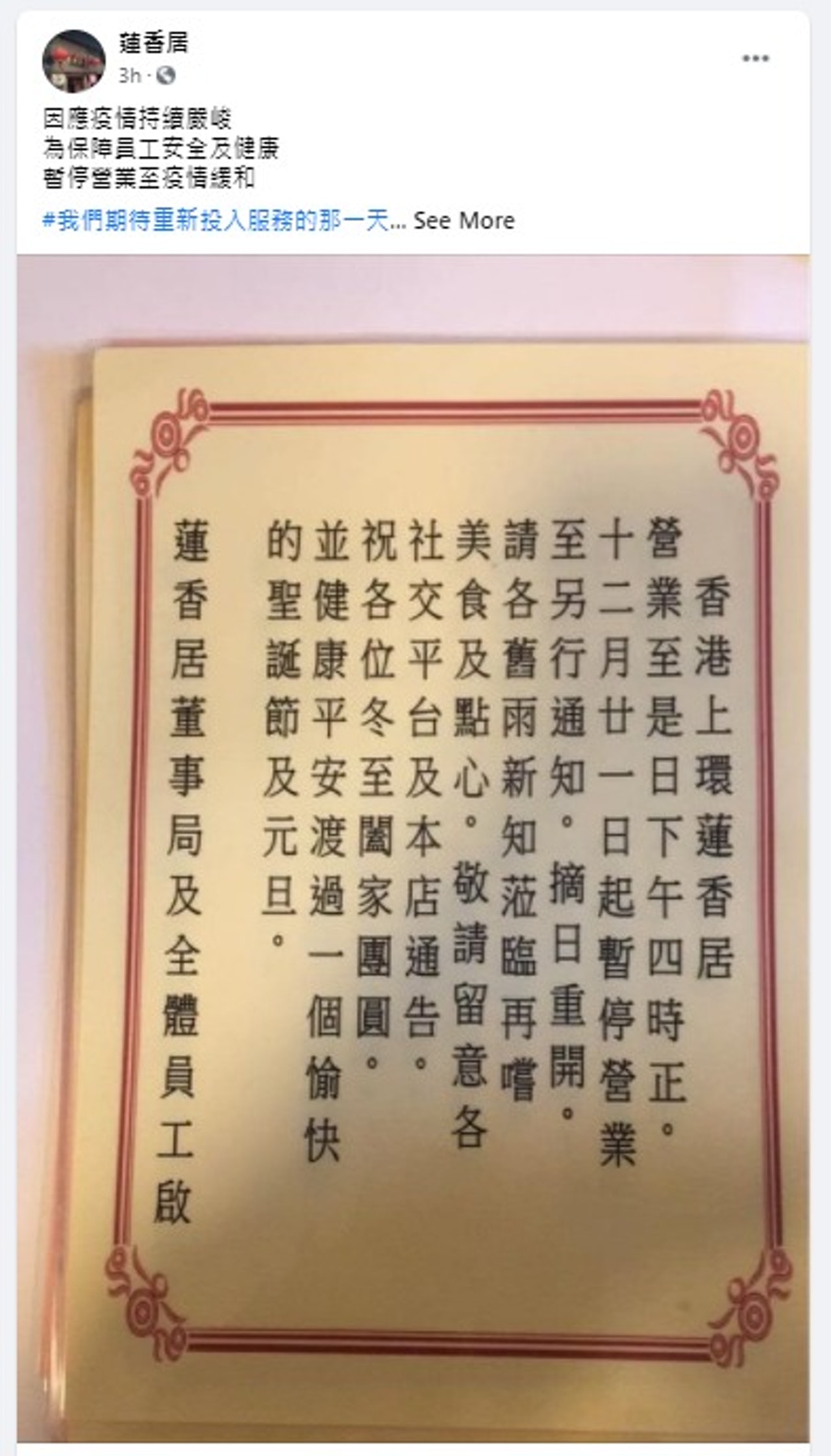 蓮香居晚上在社交媒體發文指,「因應疫情持續嚴峻,為保障員工安全及健康,暫停營業至疫情緩和」,並將會擇日重開。