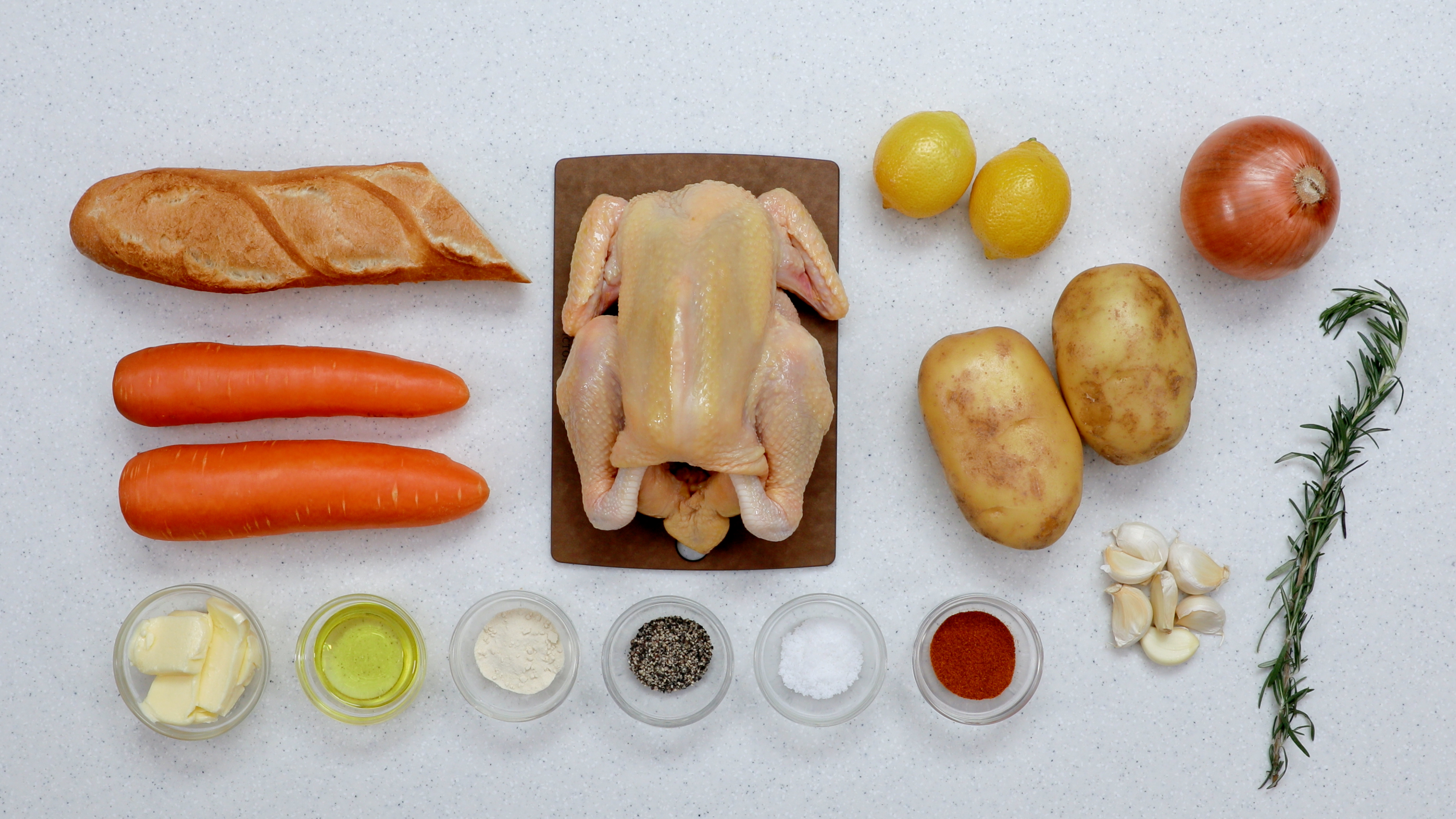 材料準備:雞1隻(1.8kg)、迷迭香3條、迷迭香(醃料用)3g、蒜頭1瓣、連皮蒜頭6瓣、牛油(室溫)15g、紅辣椒粉1/4茶匙、檸檬(刨皮用)半個 、檸檬1個、馬鈴薯2個、紅蘿蔔2條、洋蔥1個、橄欖油2湯匙、鹽和胡椒粉少許、法包1條