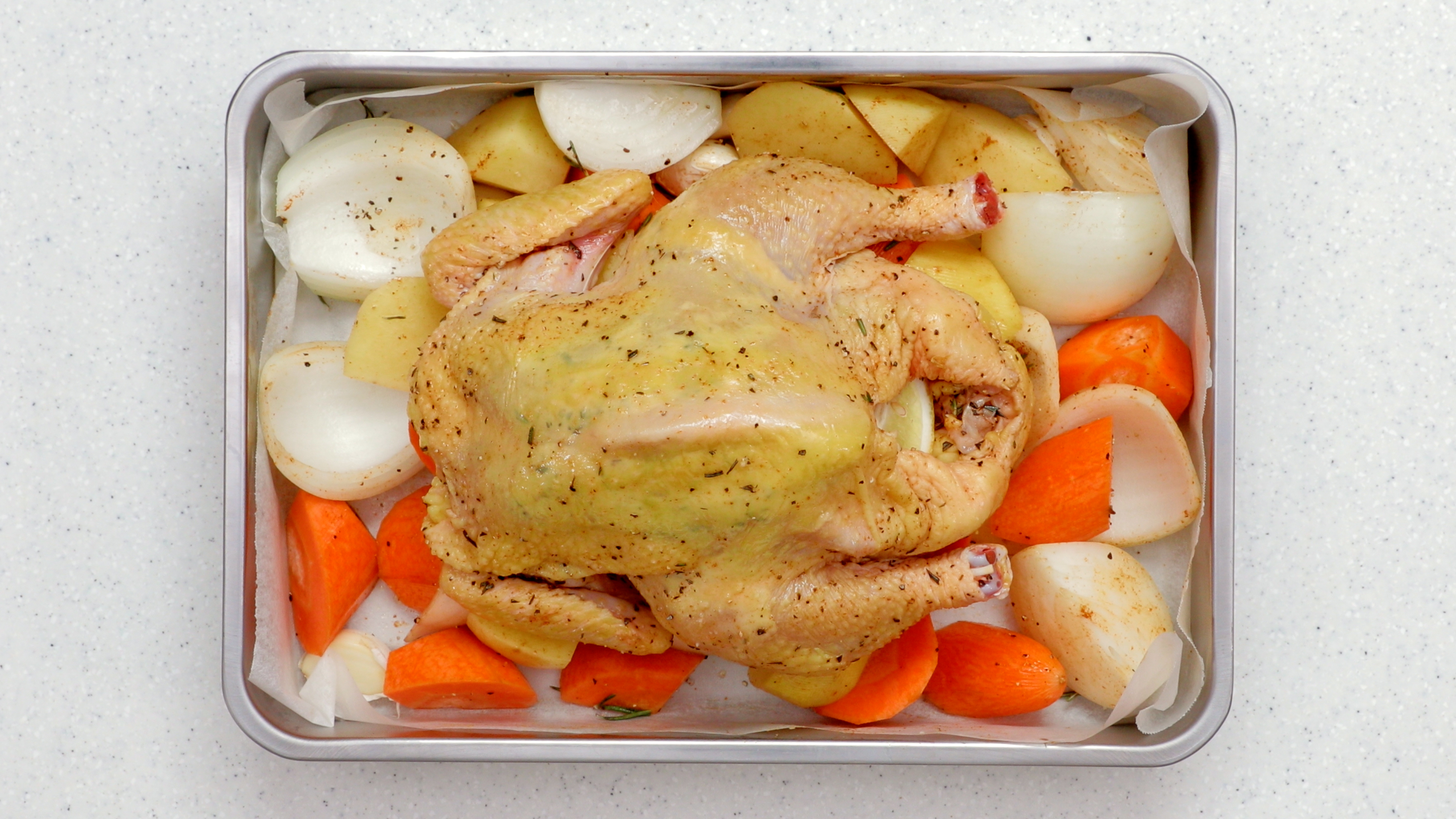 6. 將馬鈴薯、紅蘿蔔、洋蔥、蒜頭、已分開莖與葉的迷迭香放進焗盤。須要注意,洋蔥容易烤焦,建議放在雞可覆蓋的位置。再加入橄欖油、鹽以及胡椒粉,用烹調匙略拌後,在食材上放上雞隻。