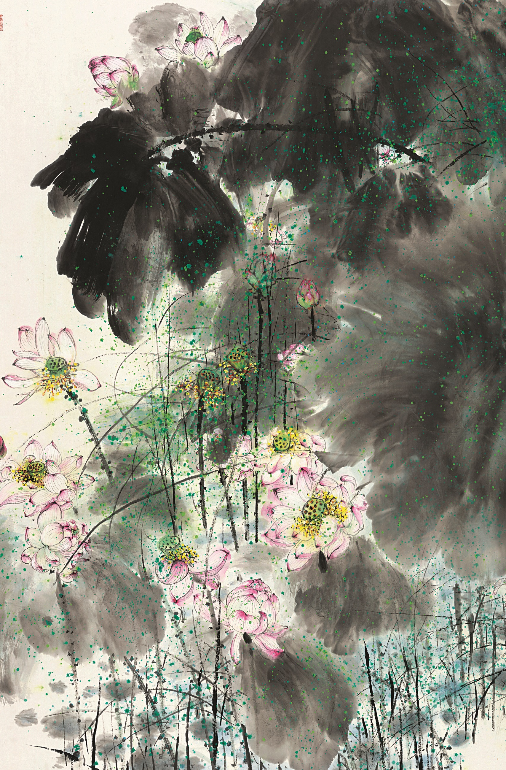 荷花也是中國畫藝術不朽的主題,歷代畫家以各具異彩的筆法墨韻演繹了多姿多彩的荷花圖景,賦予荷花以人格化之美,盡情極致地詮釋了荷之雅潔溫潤之美。如明代徐青藤以大寫意筆法繪製墨荷,縱橫恣肆,暢快淋漓;陳洪綬畫荷筆法勁健,敦厚樸茂;現代的齊白石獨創紅花墨葉畫法,相映成趣;吳昌碩以篆書筆法入畫,骨力雄健;張大千的潑墨潑彩畫法,風姿曼妙。而蕭暉榮畫荷,則轉益多師,而後融會貫通,自成一家。他筆下的荷花圖,於筆勢墨韻加意經營之外,亦注重表現荷花之明豔淡雅、香遠益清之氣質,尤為著意展現荷塘的繁盛景致,場面壯觀,氣韻生動。他早年畫荷的作品,多潑墨寫意,酣暢淋漓;近年畫荷,則兼工帶寫,將雄健筆力與婀娜韻致熔於一爐,美不勝收。