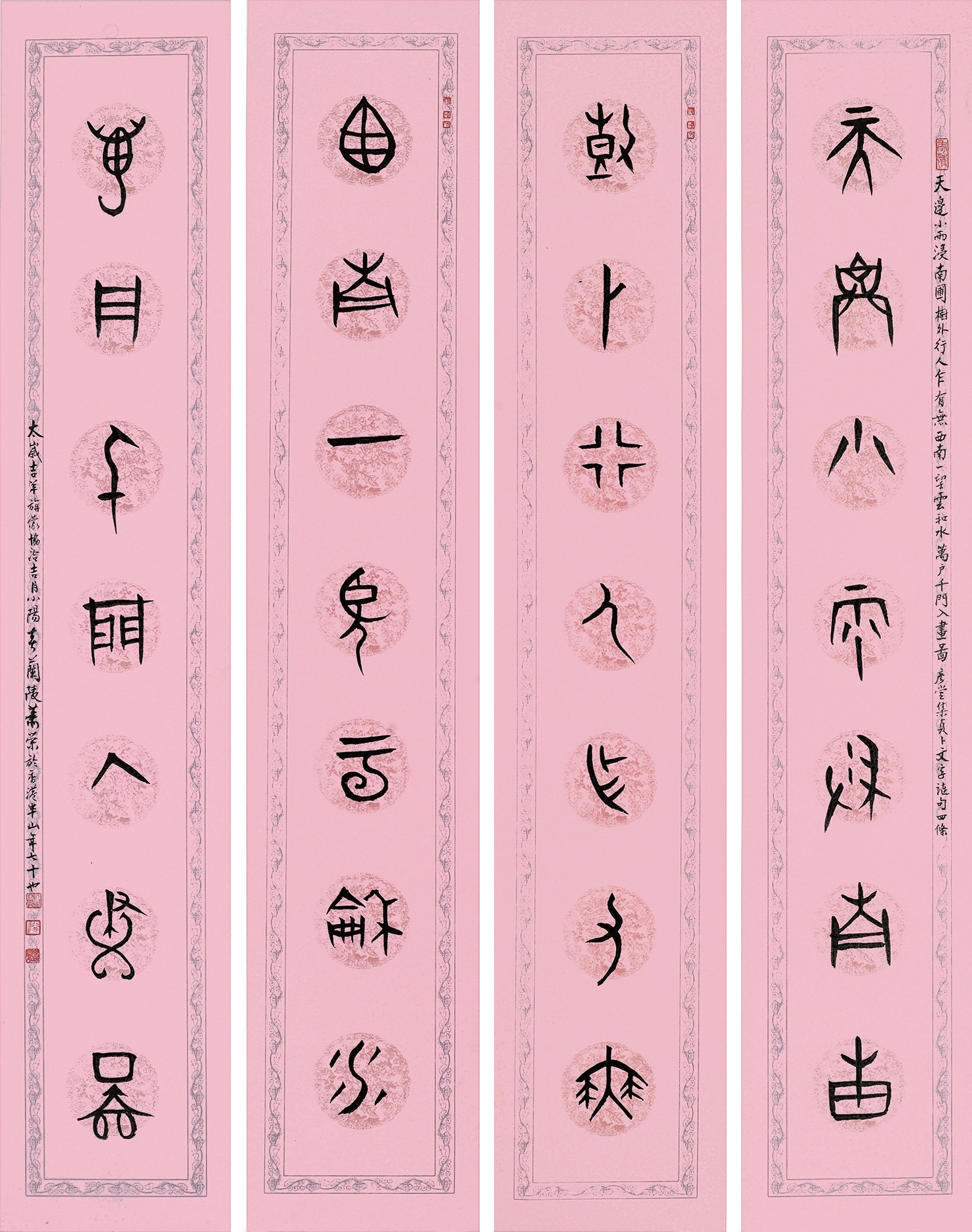 蕭暉榮4幅甲骨文作品《天邊小雨浸南圃 樹外行人乍有無 西南一望雲和水 萬戶千門入畫圖(甲骨文)》,2015年,每幅68×13cm。