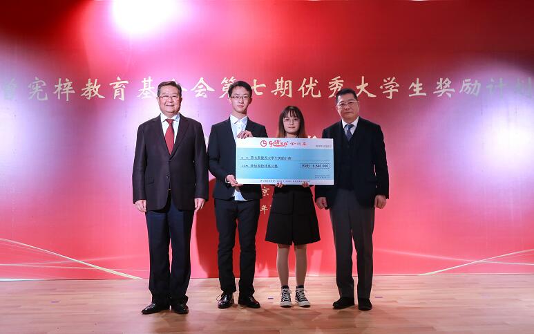 曾宪梓教育基金会理事长曾智明(右一),副理事长刘利民(左一)向优秀大学生代表颁发獎金。