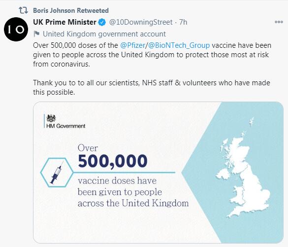 新冠病毒新變種仍在英國迅速傳播,據英國路透社報道,英國首相約翰遜當地時間21日表示,英國已有超過50萬人接種了新冠疫苗。
